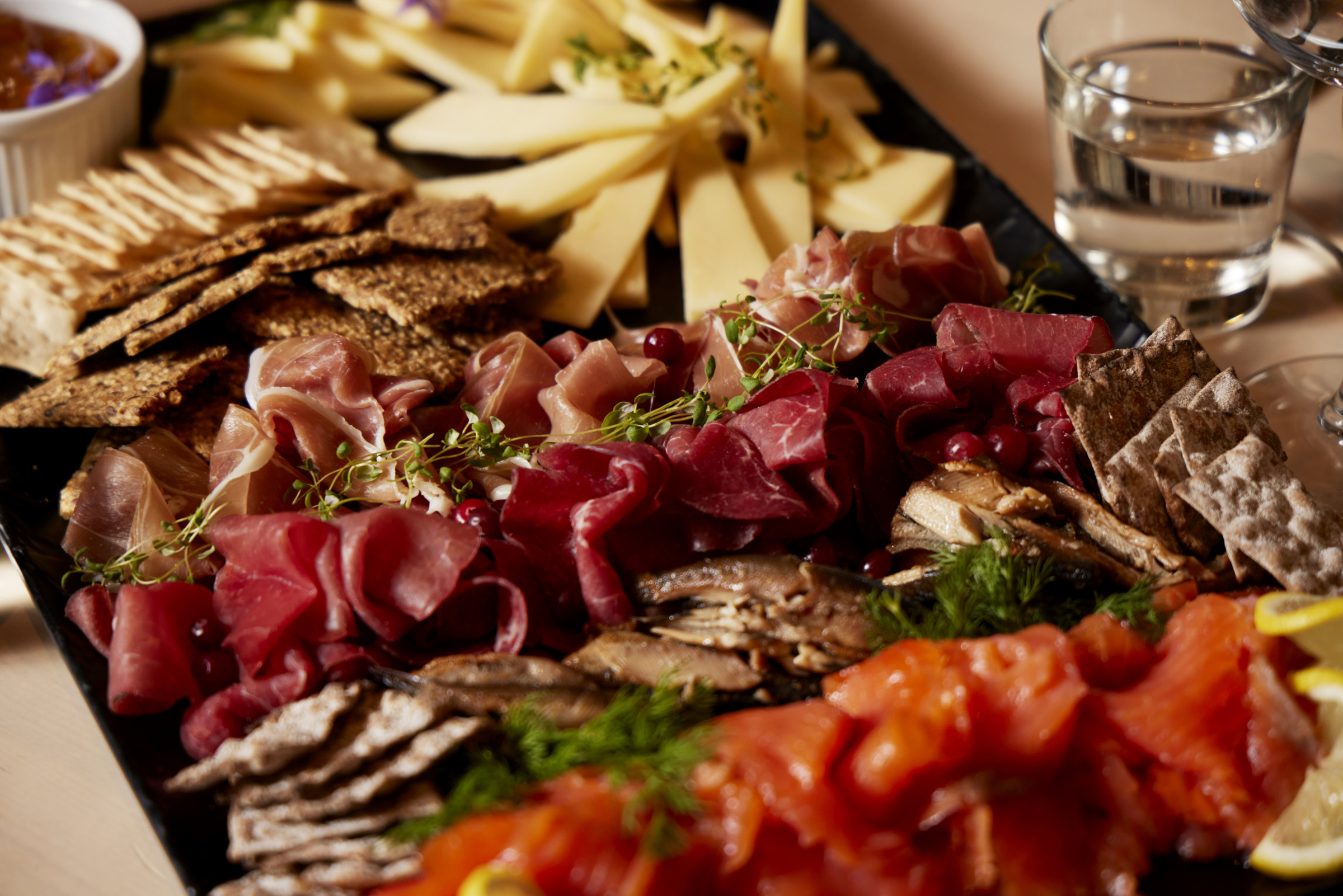 – house-made bread with spread, local fish and meet, marinated tomatoes, rye crisps, local cheeses, cloudberry jam and chocolates
